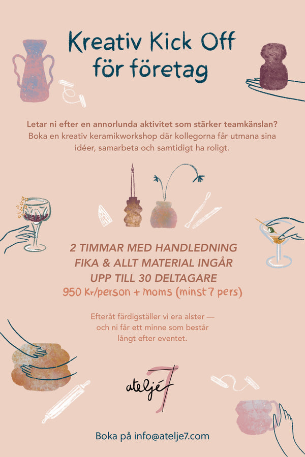 Ateljé 7 är ett arthouse i centrala Stockholm med lera i fokus. Här kan du vara medlem på olika nivåer och skapa inom vad du vill när det kommer till konst. Minst en gång i månaden har vi masterclass med verksamma artister inom hantverk och skapande.